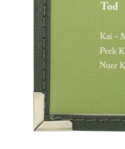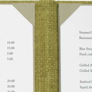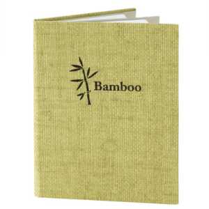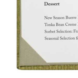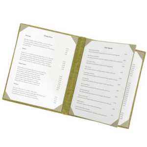 - The cover material wraps around a rigid board, and angled corners hold your menu paper in place.