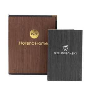 - Our Authentic Wood Menu Covers make a lasting impression! Crafted with a 1/4″ thick wood front panel, your name or logo is laser-engraved onto the cover in a single location for a sophisticated touch.Choose from cherry, oak, or walnut wood finishes. The spine, back cover, inside panels, and picture corners are elegantly made with imitation leather. The result is a beautifully refined and durable product.